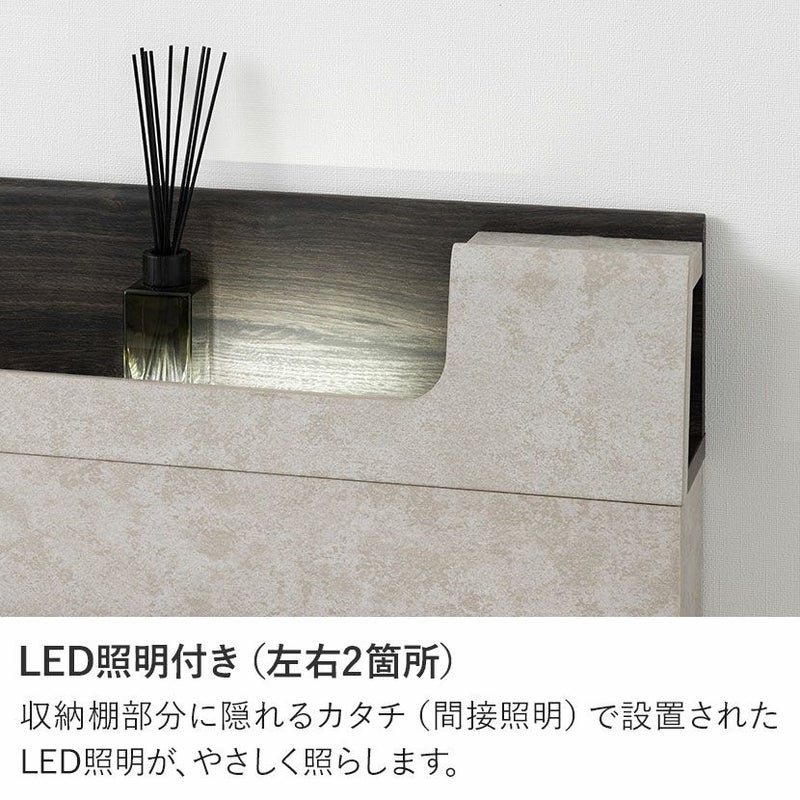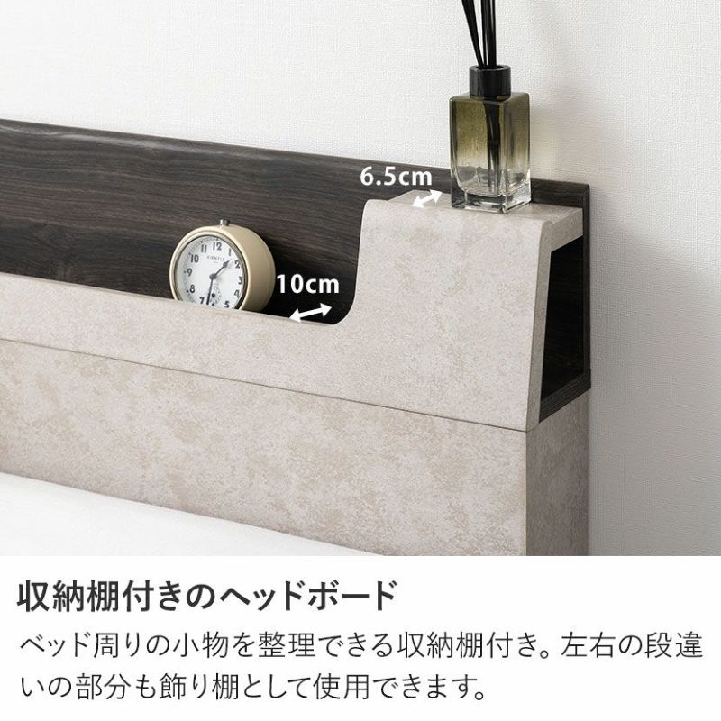 ベッド周りの小物を整理できる収納棚付き。左右の段違いの部分も飾り棚として使用できます。