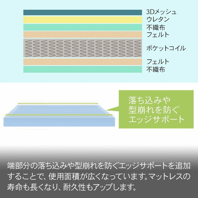 端部分の落ち込みや型崩れを防ぐエッジサポートを追加することで、使用面積が広くなっています。