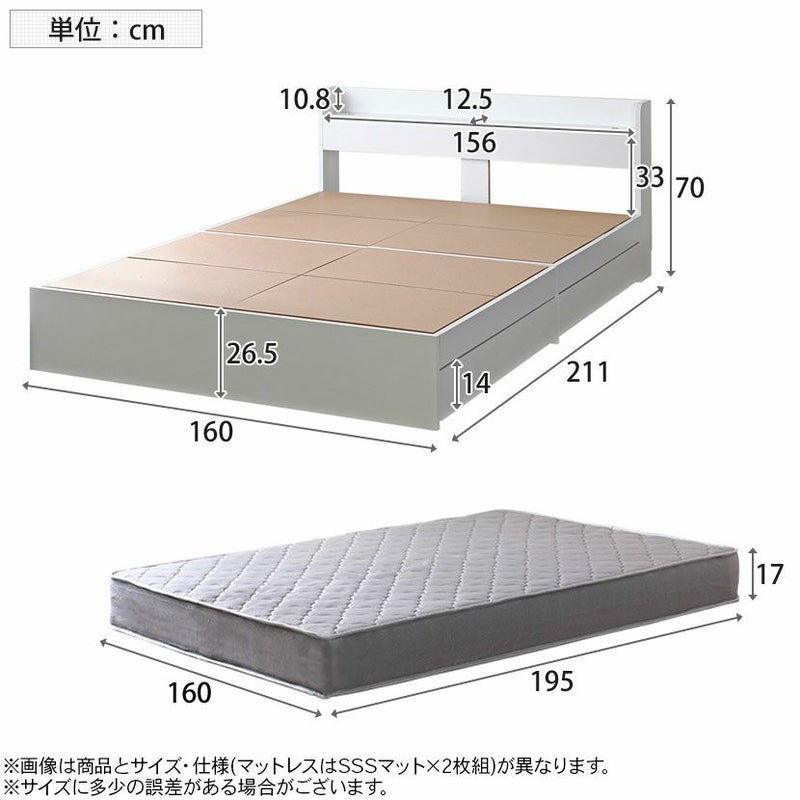 | サイズ | ベッドフレーム / 幅1600×奥行2110×高さ700mm 引き出し有効内寸 / 幅910×奥行370×高さ50mm マットレス(1枚あたり) / 幅800×奥行1950×高さ170mm |
