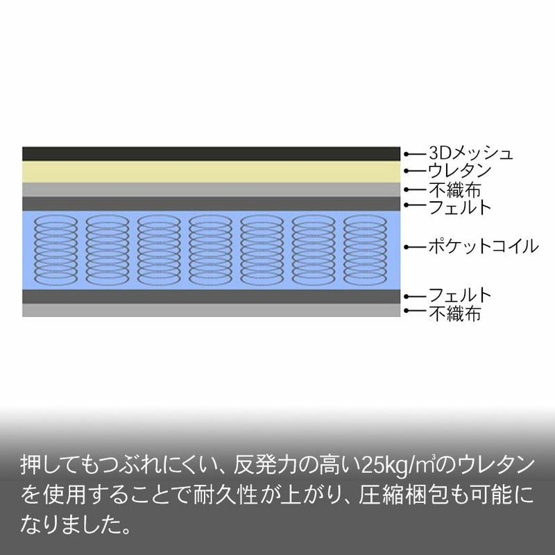 押してもつぶれにくい反発力の高い「25kg/立方メートル」のウレタンを使用しています。こちらの素材を使用することで圧縮梱包が可能になりました。線径2mmのコイルなので、型崩れしにくいのもポイントです。