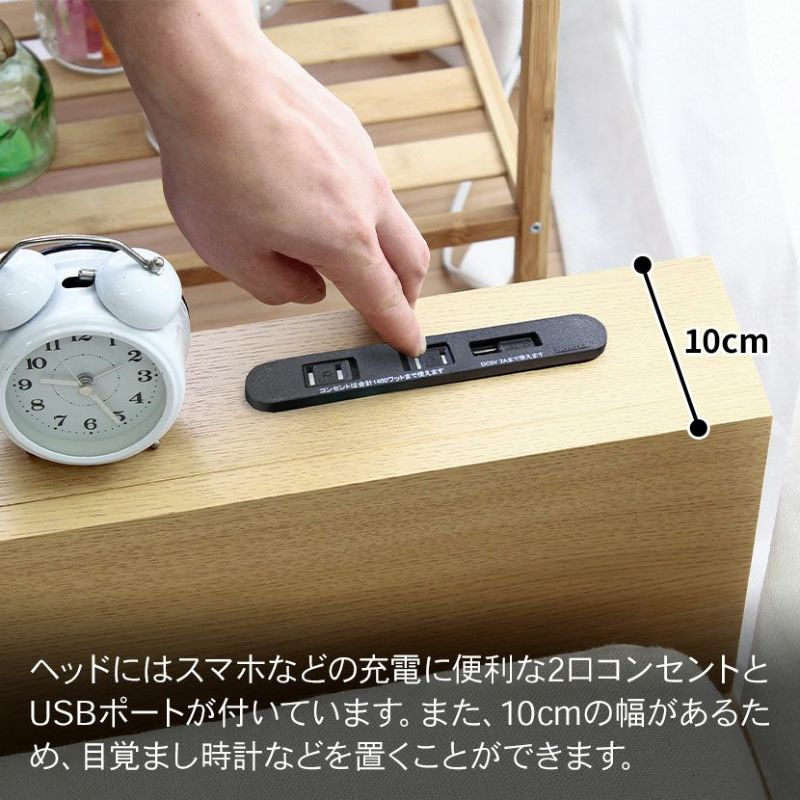 ●目覚まし時計などを置けるヘッドボードには、スマホなどの充電に便利な2口コンセントが付いています。