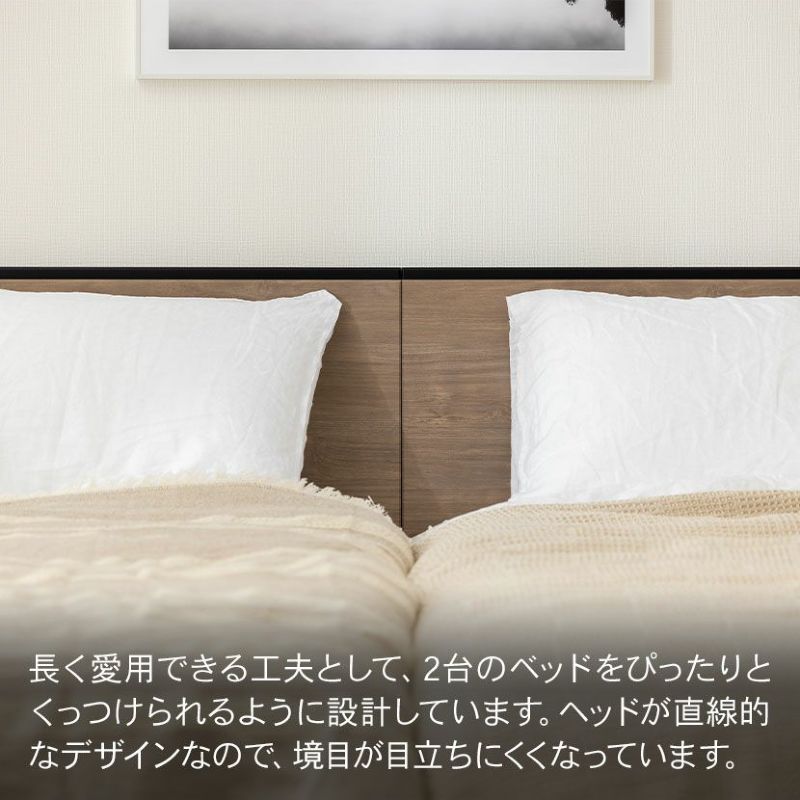 低ホルムアルデヒド(F☆☆☆☆)の人に優しい素材のみを使用しています。フラットなヘッドボードなので、2台並べて使用しても境目が分かりづらく、すっきりとした印象です。白みがかった色味のグレー木目と、落ち着いた色味のウォルナット木目の2色からお選びいただけます。