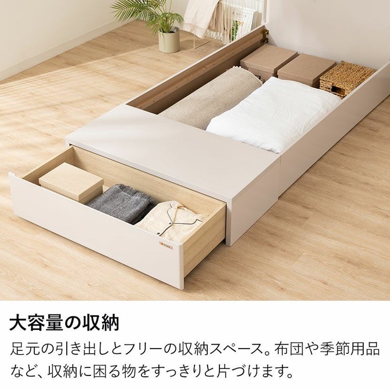 足元の引き出しとフリーの収納スペース。布団や季節用品など、収納に困る物をすっきりと片づけます。