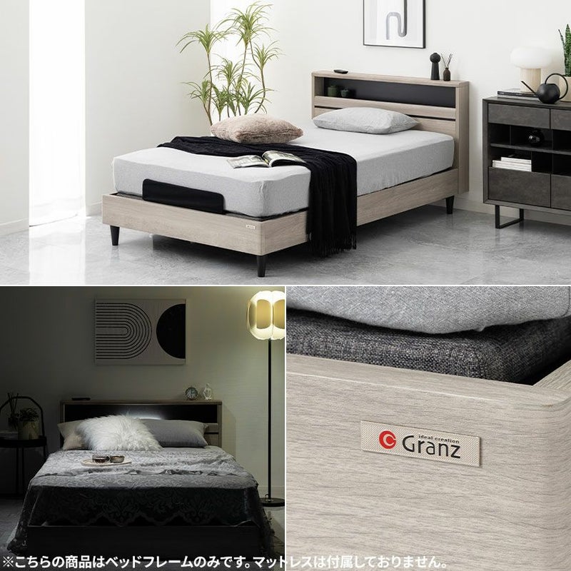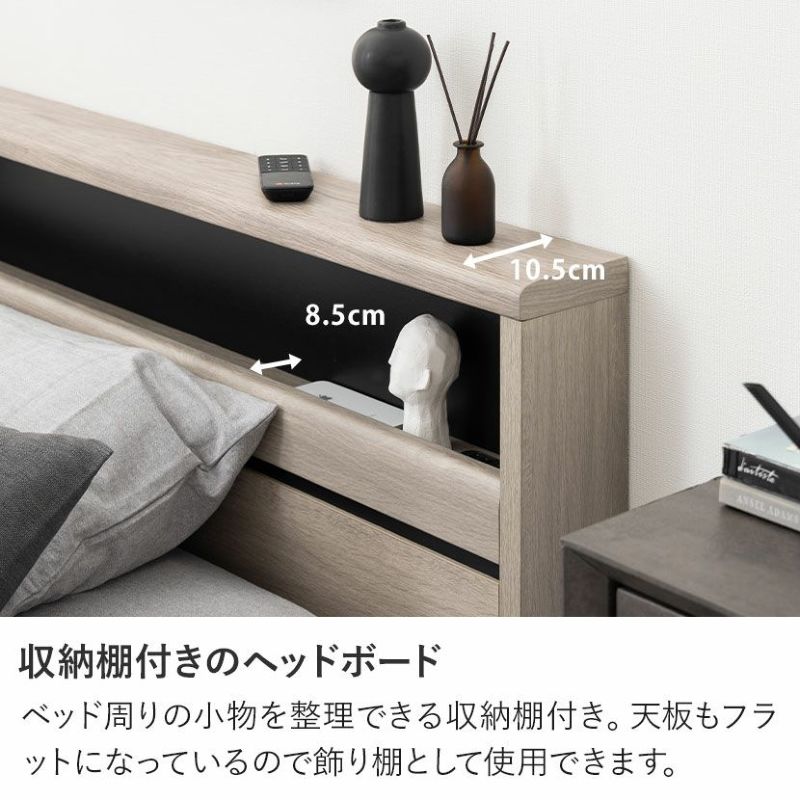 ベッド周りの小物を整理できる収納棚付き。左右の段違いの部分も飾り棚として使用できます。