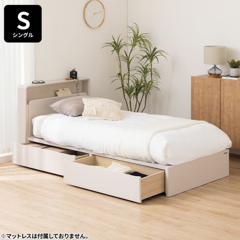 材質 | ベッドフレーム / カラープリント紙化粧繊維板、オーク柄プリント紙化粧繊維板 ヘッドボード一部、フットボード、引き出し前板 / ウレタン樹脂塗装 床板 / 布張り |