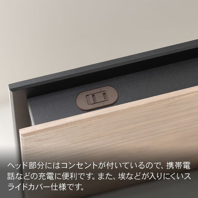低ホルムアルデヒド(F☆☆☆☆)の人に優しい素材のみを使用しています。フラットなヘッドボードなので、2台並べて使用しても境目が分かりづらく、すっきりとした印象です。白みがかった色味のグレー木目と、落ち着いた色味のウォルナット木目の2色からお選びいただけます。