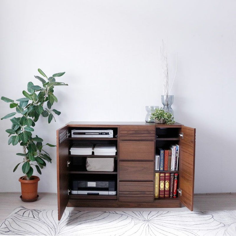手前に引き出せるスライド棚が最下段に付いているので、プリンターなどの収納に便利です。