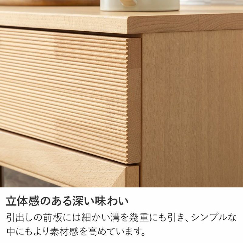 引出しの前板には細かい溝を幾重にも引き、シンプルな中にもより素材感を高めています。