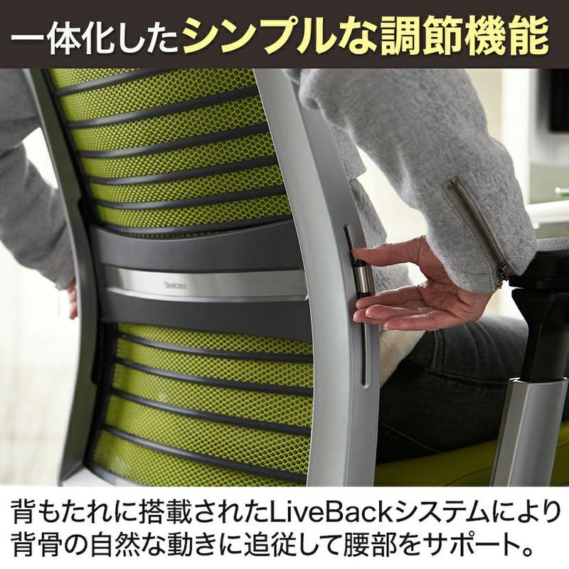 | 機能 | ・統合LIVEBACK(ライブバック)テクノロジー 背もたれにフレクサー(樹脂ワイヤー)機構内蔵。姿勢の変化に追従し腰椎周辺をサポート。 ・座面高さ調節 ・座面奥行き調節 ・コンフォートダイヤル アップライトバックロック ミッドストップリクライニング 体重感知機構付きリクライニング(20%増) 体重感知機構付きリクライニング |