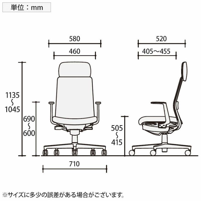 | サイズ(本体) | 外寸 / 幅710×奥行710×高さ1045~1135mm 座面 / 幅460×奥行405~455mm 座面高さ / 415~505mm 肘高さ / 600~690mm |