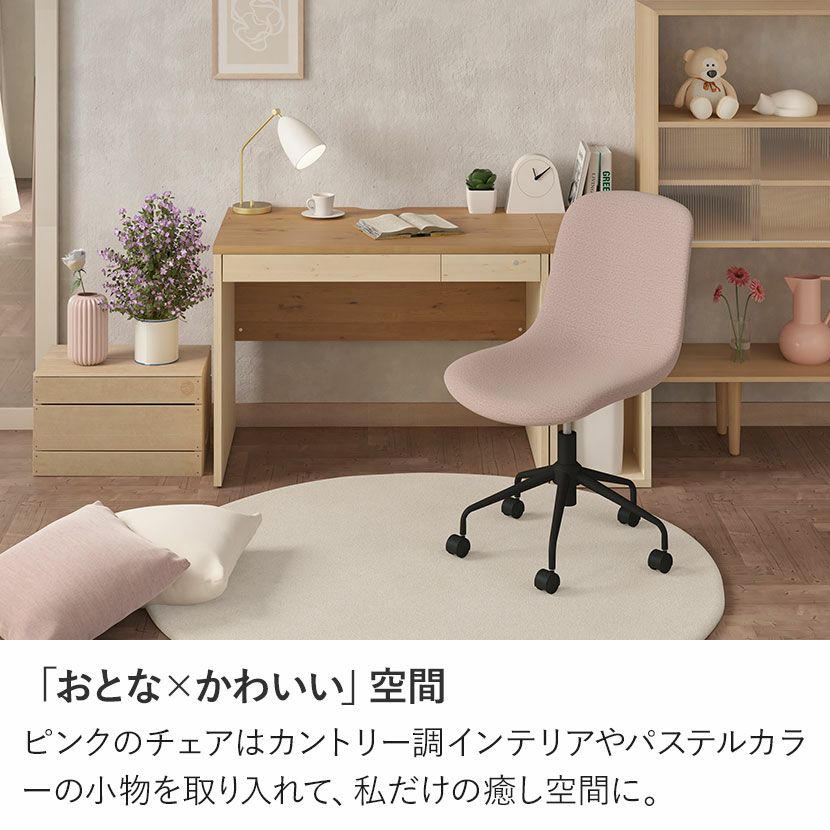 ピンクのチェアはカントリー調インテリアやパステルカラーの小物を取り入れて、私だけの癒し空間に。