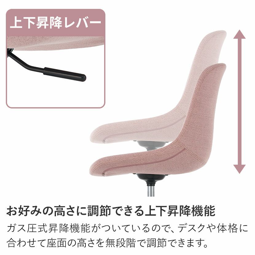 ●お好みの高さに調節できる上下昇降機能ガス圧式昇降機能がついているので、デスクや体格に合わせて座面の高さを無段階で調節できます。