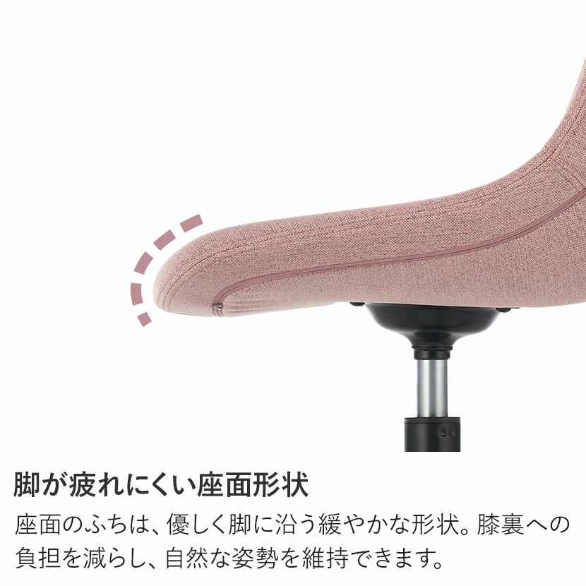座面のふちは、優しく脚に沿う緩やかな形状。膝裏への負担を減らし、自然な姿勢を維持できます。