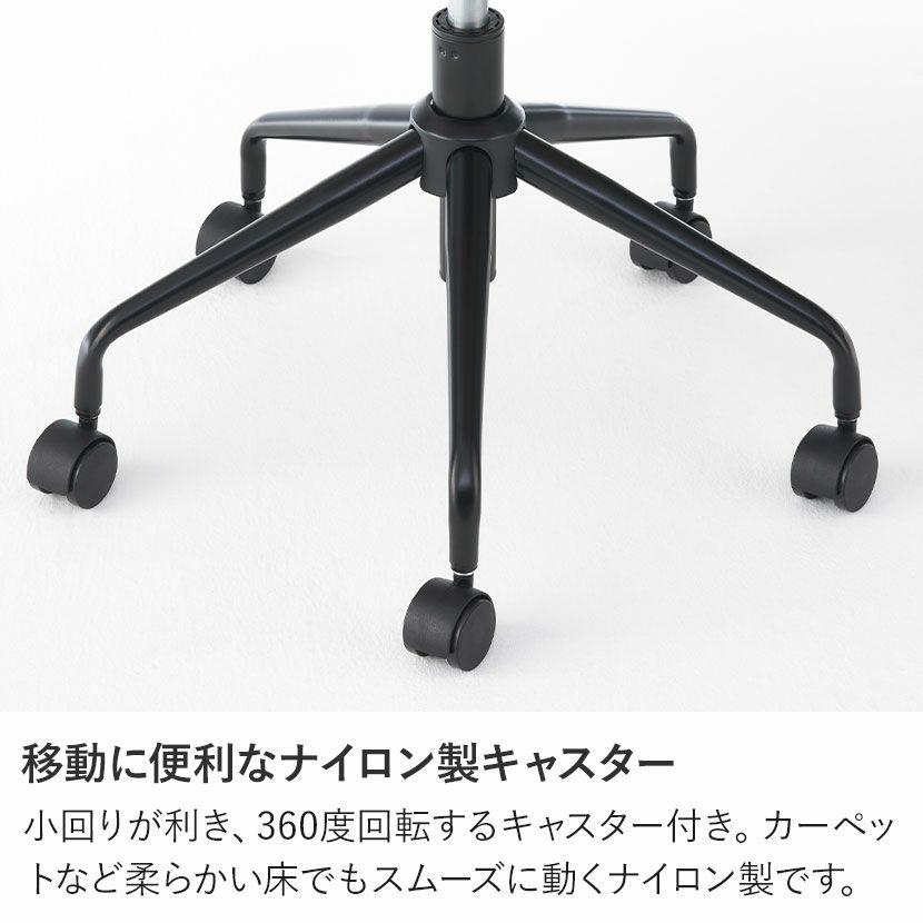 小回りが利き、360度回転するキャスター付き。カーペットなど柔らかい床でもスムーズに動くナイロン製です。