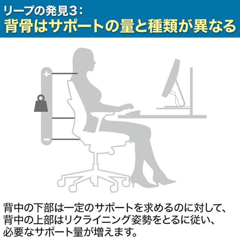 背中の下部は一定のサポートを求めるのに対して、背中の上部はリクライニング姿勢をとるに従い、必要なサポート量が増えます。