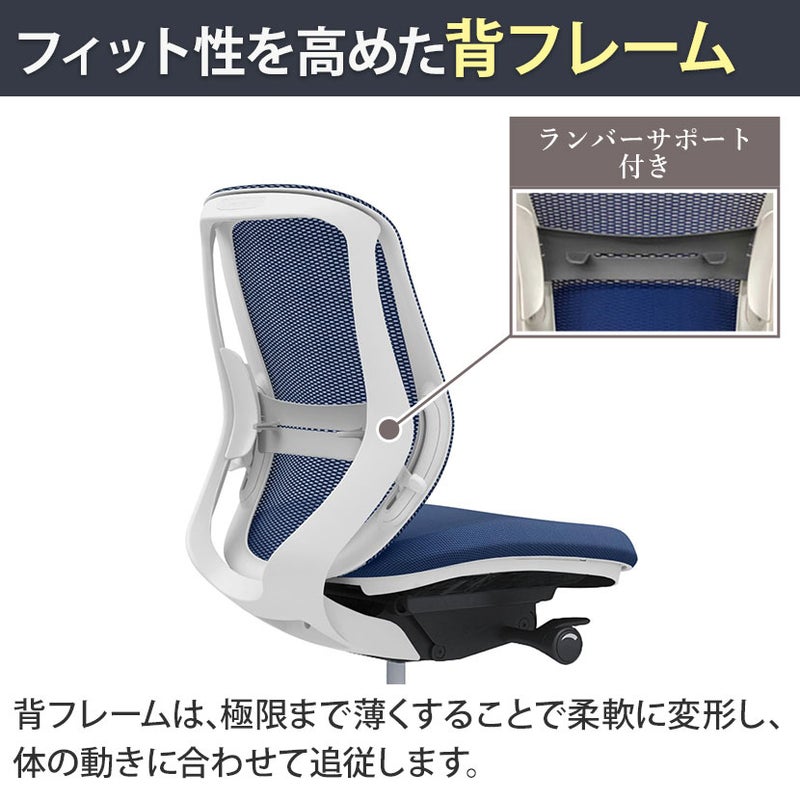 | 機能・特徴 | ・バックカーブアジャスト機構(背もたれのカーブを2段階で調整可能) ・ベンディング機能 カラダと背もたれのフィット感を向上させるため、背タイプに適した形状を採用。 ・前傾機能付き背座シンクロリクライニング リクライニング角度33度(前傾10度、後傾23度)、有段階ピッチ固定可能(4段階) リクライニング強弱調整 ・座面高さ調節(ストローク100mm) ・座面奥行き調整(ストローク50mm) |