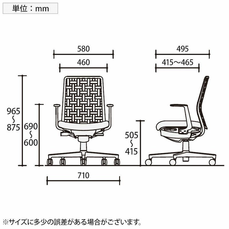 | サイズ(本体) | 外寸 / 幅710×奥行710×高さ875~965mm 座面 / 幅460×奥行415~465mm 座面高さ / 415~505mm 肘高さ / 600~690mm |