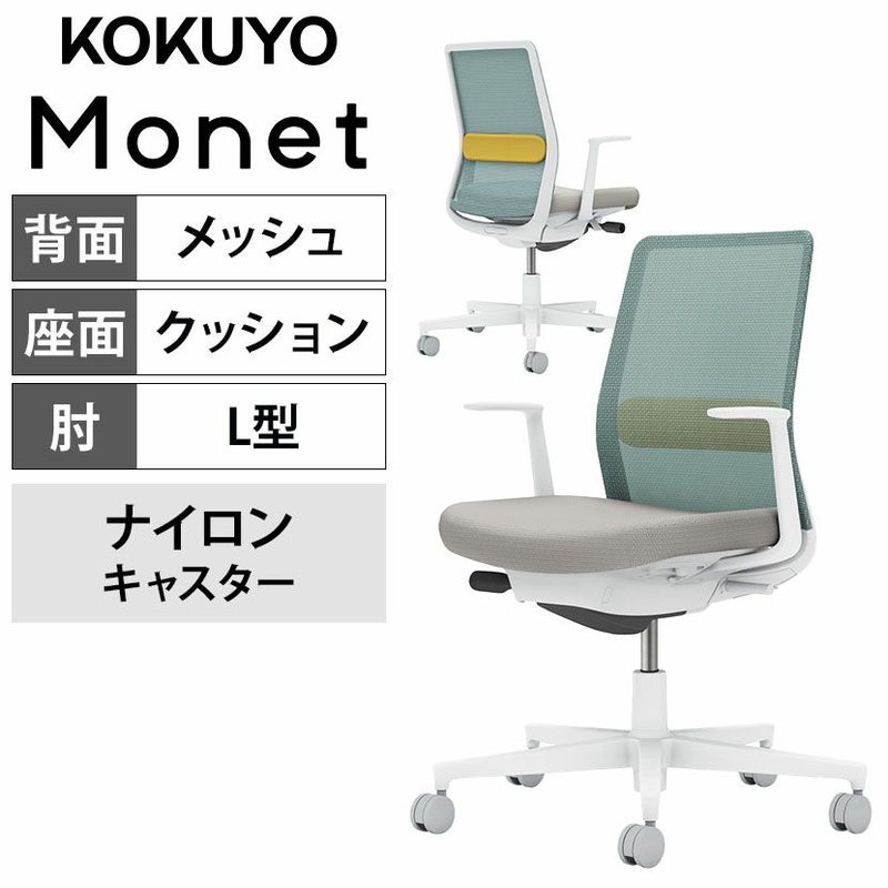 【設置無料】 ワークチェア モネット Monet オフィスチェア L字肘(固定肘) 樹脂脚 ナイロンキャスター ランバーサポート付き(オリーブイエロー) 背メッシュ 座面布張り 本体/脚ホワイトグレー 背アッシュターコイズ 座ライトグレー C03-W112W-WE2391S1 コクヨ 椅子