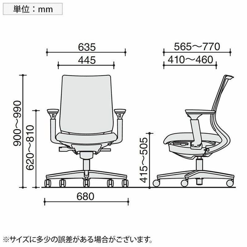 | サイズ | 外寸 / 幅680×奥行680×高さ900~990mm 座面 / 幅445×奥行410~460mm 座面高さ / 415~505mm 肘高さ / 620~810mm |