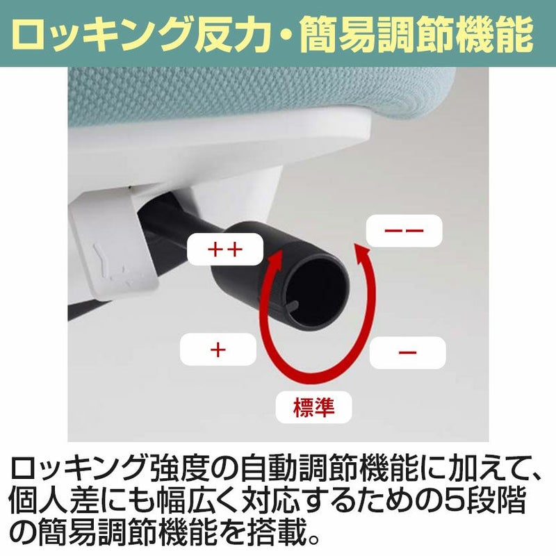 | 機能 | ・座面高さ調整(90mmストローク) ・座面奥行調整(50mmストローク) ・オートフィットシンクロロッキング バランスをとりやすい反力特性に自動的に調整します。 ・ロッキング反力簡易調節(5段階) ・ロッキング角度範囲調節(0度、6度、13度、20度) ・肘位置調整 上下ストローク100mm、前後ストローク80mm、角度内側25度で調整可能。 |