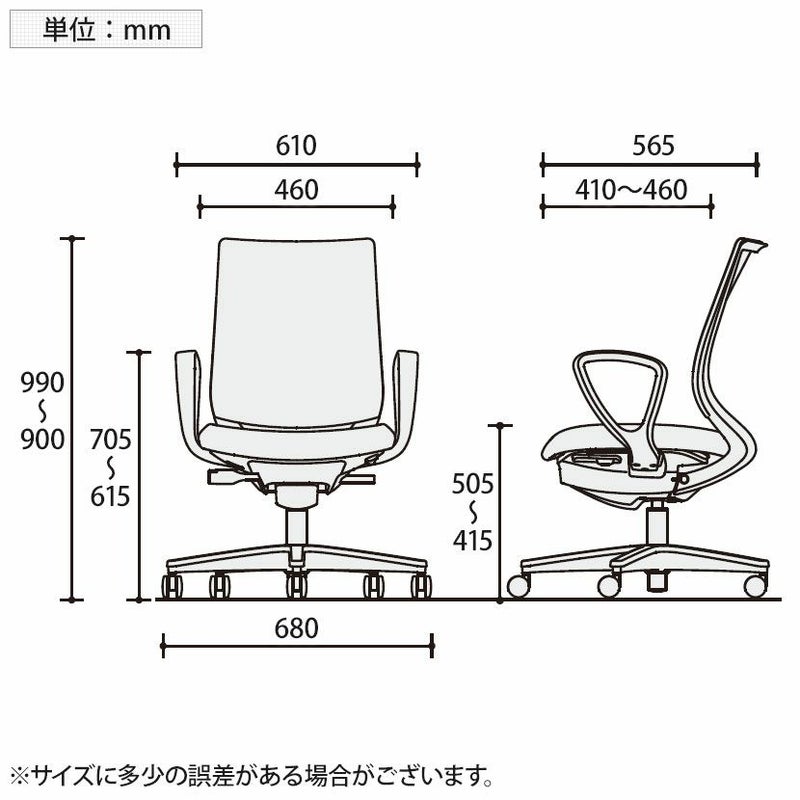 | サイズ(本体) | 外寸 / 幅680×奥行680×高さ900~990mm 座面 / 幅460×奥行410~460mm 座面高さ / 415~505mm 肘高さ / 615~705mm |