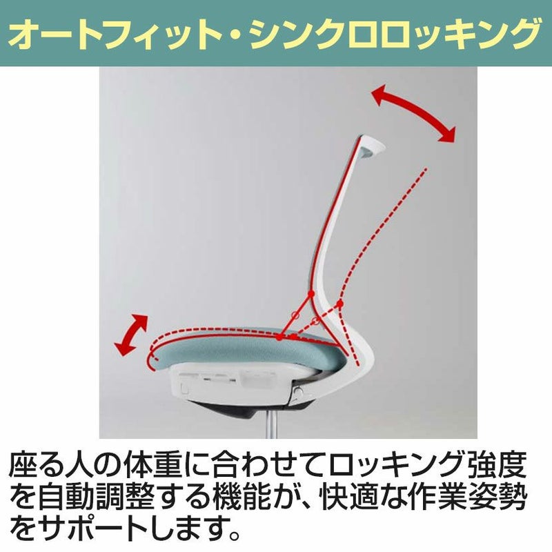 | 機能 | ・座面高さ調整(90mmストローク) ・座面奥行調整(50mmストローク) ・オートフィットシンクロロッキング バランスをとりやすい反力特性に自動的に調整します。 ・ロッキング反力簡易調節(5段階) ・ロッキング角度範囲調節(0度、6度、13度、20度) |