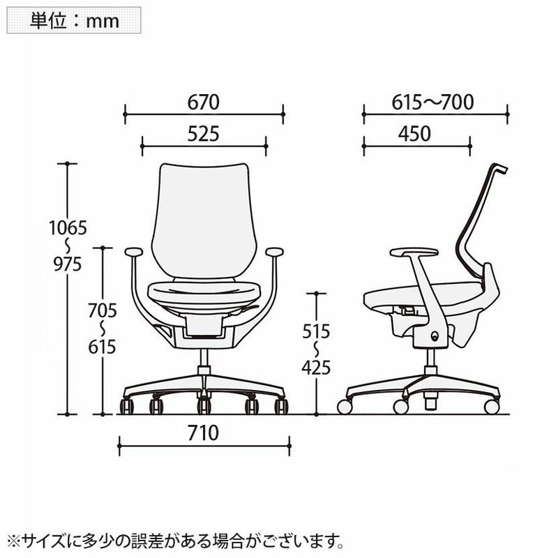 | サイズ(その他) | 座面 / 幅525×奥行450mm 肘高さ / 615~705mm 座面高さ / 425~515mm |