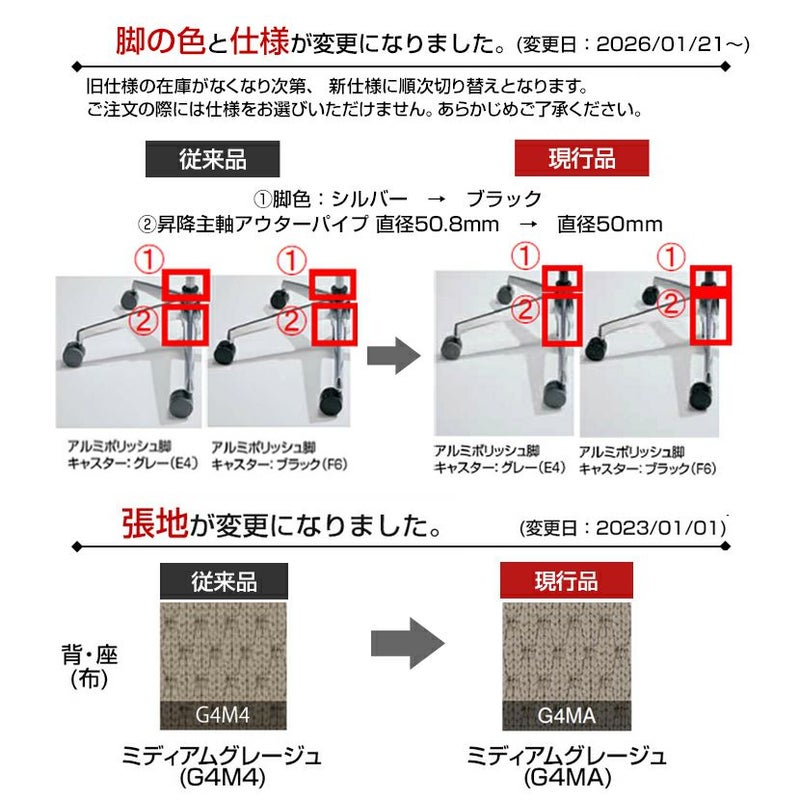 | 変更点 | ・材質:ミディアムグレージュ張り地変更(G4M4⇒G4MA) (変更日:2023年1月1日) ・脚(昇降主軸ロッド色):シルバー ⇒ブラック に変更 ・昇降主軸アウターパイプ直径:50.8mm ⇒ 50mm に変更 (変更日:2026年1月21日) |