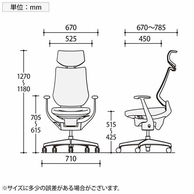 | サイズ(その他) | 座面 / 幅525×奥行450mm 肘高さ / 615~705mm 座面高さ / 425~515mm |