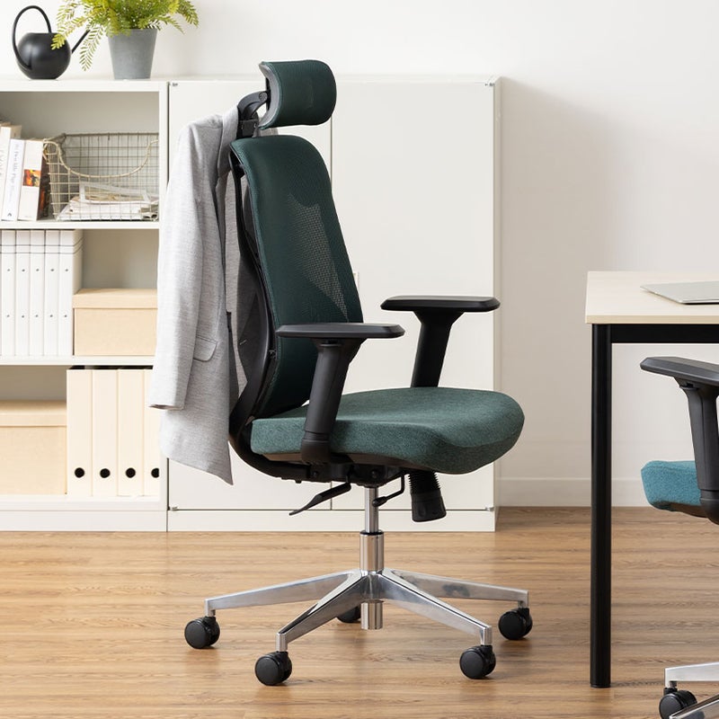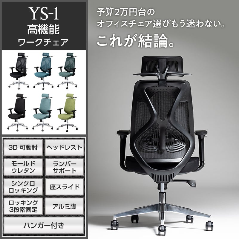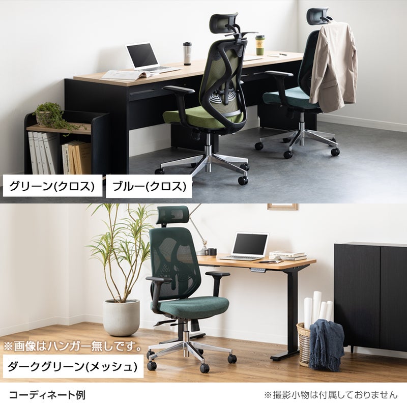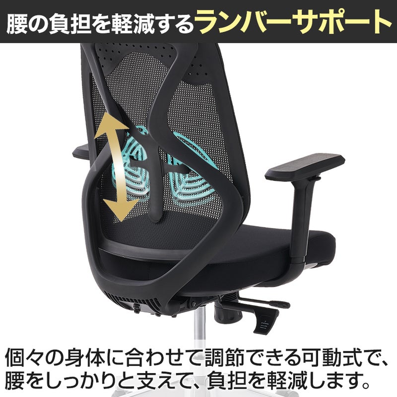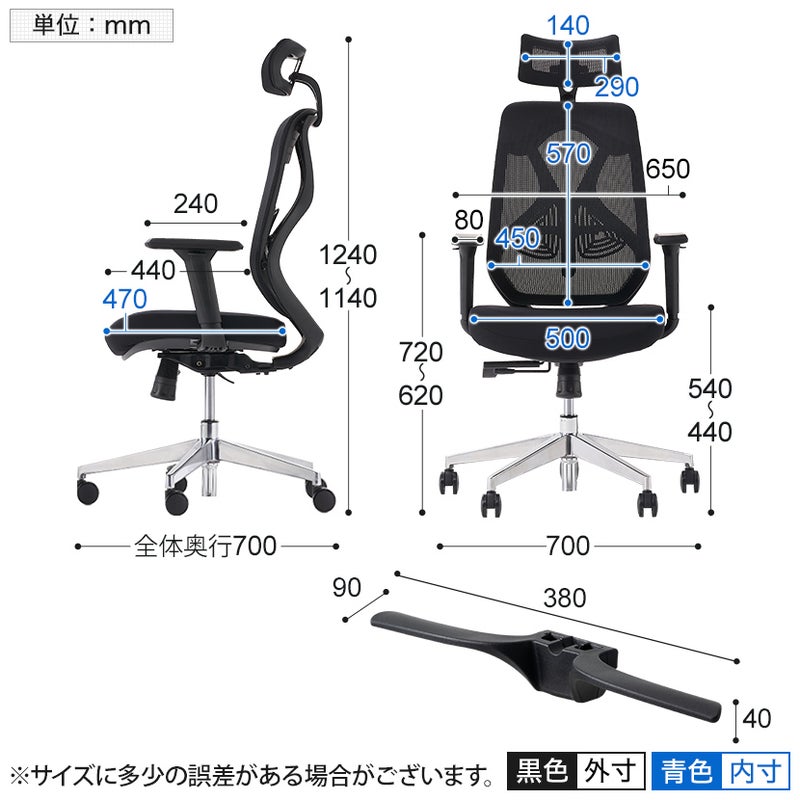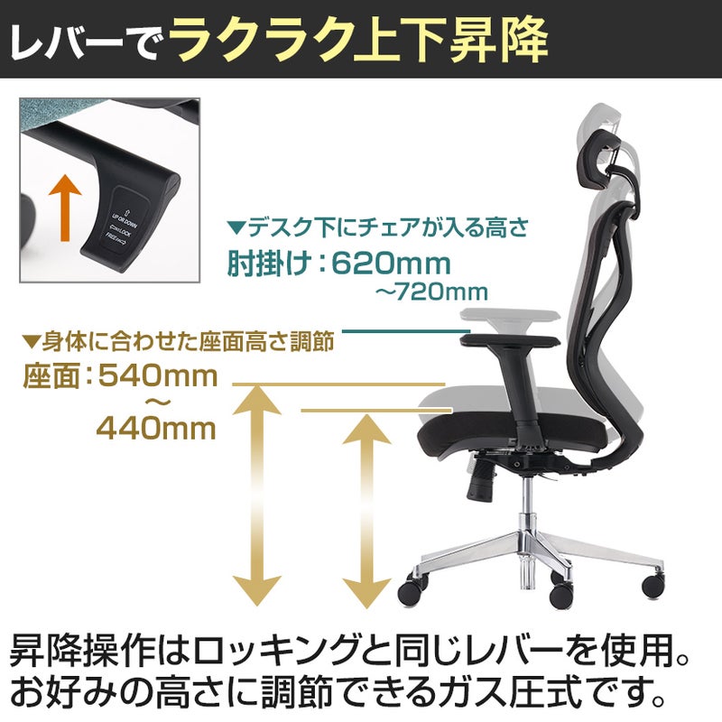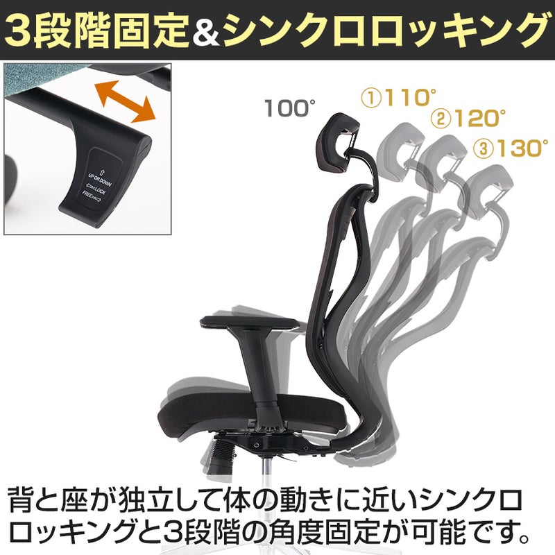 | 備考 | シンクロロッキング機構(3段階固定可能)、座面位置調整可能(スライド機能付き)、ランバーサポート位置調節、肘角度調整・前後スライド・高さ5段階調整、ヘッドレスト上下角度調節、ロッキング強度調節、ガス圧式座昇降、ハンガー付き |
