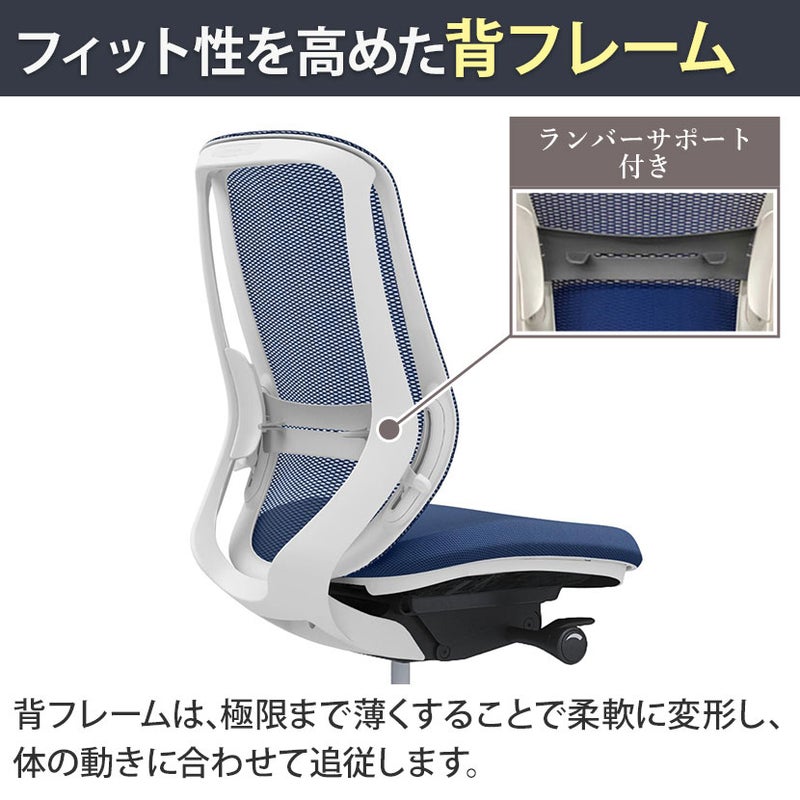 | 機能・特徴 | ・バックカーブアジャスト機構(背もたれのカーブを2段階で調整可能) ・ベンティング機能 カラダと背もたれのフィット感を向上させるため、背タイプに適した形状を採用。 ・前傾機能き背座シンクロリクライニング リクライニング角度33度(前傾10度、後傾23度)、有段階ピッチ固定可能(4段階) リクライニング強弱調整 ・座面高さ調節(ストローク100mm) ・座面奥行き調整(ストローク50mm) |
