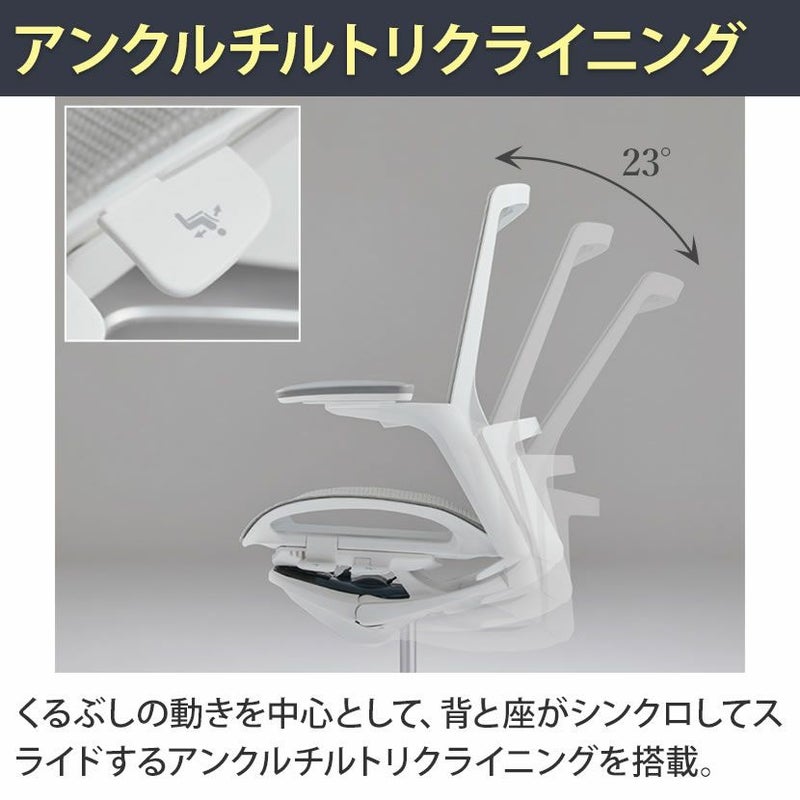 | 機能・特徴 | ・アンクルチルトリクライニング(リクライニング角度23度) くるぶしの動きを中心として背と座がシンクロしてスライドします。 ・アジャストアーム(4Dアーム) 肘パッド部の上下100mm(1D)、角度は内側15度、外側7.5度(2D)、 前後50mm(3D)、左右方向25mmずつ(4D)の調節が可能です。 ・座面高さ調節(ストローク100mm) ・座面奥行き調整(ストローク50mm) ・リクライニングの固定・解除 ・リクライニング反発力強弱調整 |