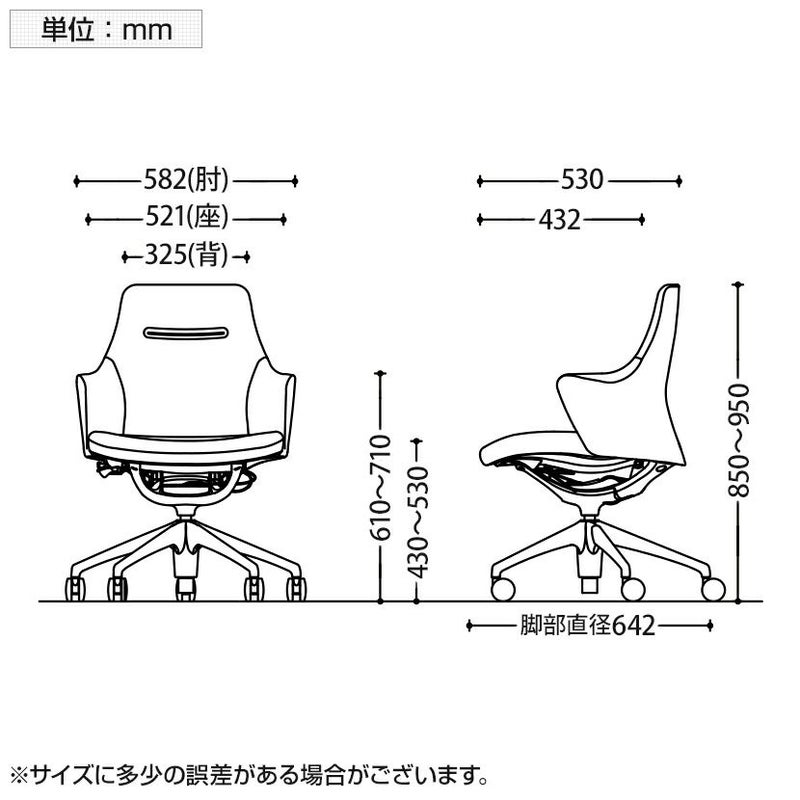 | サイズ | 外寸 / 幅582×奥行530×高さ850~950mm 座面高さ / 430~530mm 肘高さ / 610~710mm 脚 / 直径642mm |