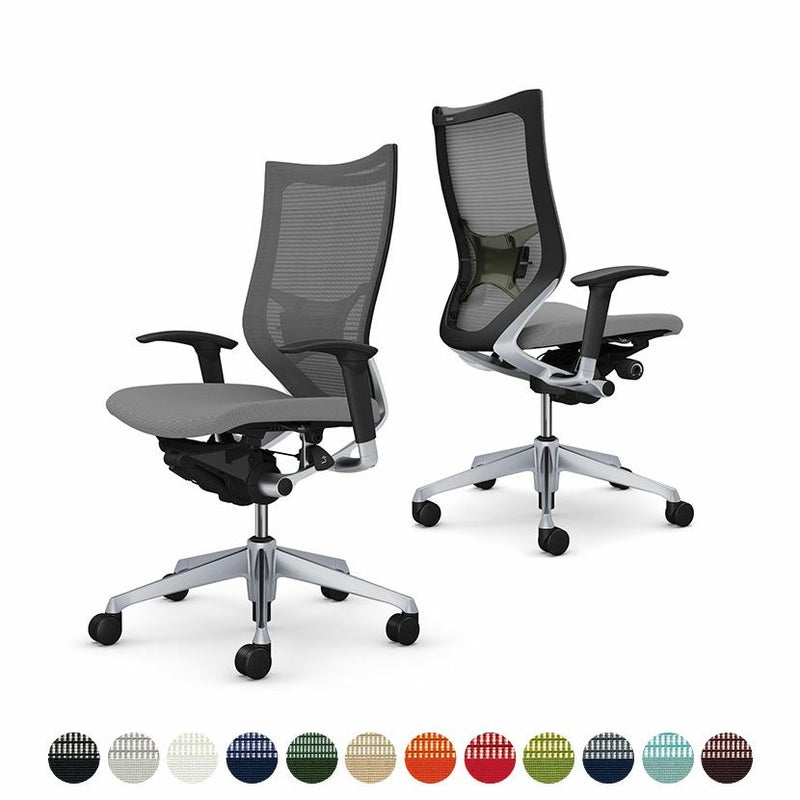 | 材質 | 背フレーム / アルミダイキャスト 肘パッド / 熱可塑性ポリウレタン アジャストアーム / アルミダイキャスト、スチール、樹脂成型品 デザインアーム / アルミダイキャスト 脚 / アルミダイキャスト キャスター / 直径60mmナイロン双輪キャスターまたは、直径60mmウレタン双輪キャスター |