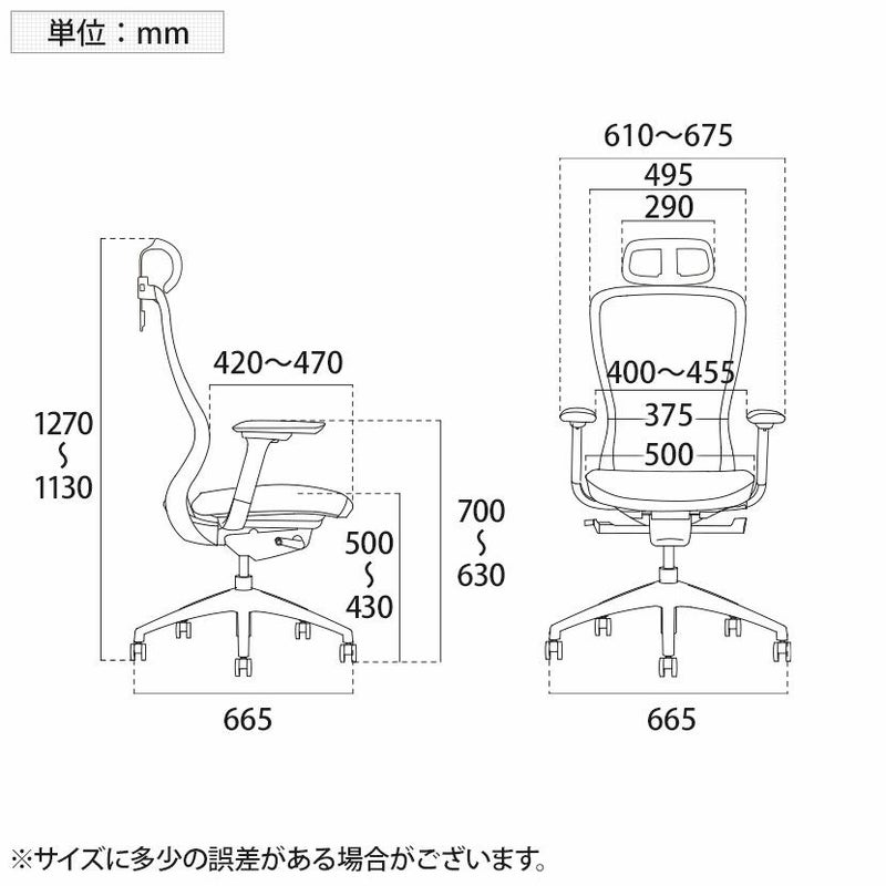 | サイズ(その他) | 座面 / 幅500×奥行420~470mm 座面高さ / 430~500mm 肘高さ / 630~700mm |