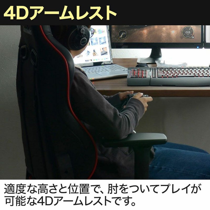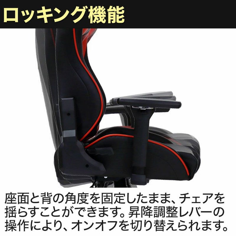 | 機能・特徴 | ・4Dアームレスト(アーム高さ70mm、パット前後40mm、パット左右20mm、回転3角度調整) ・ロッキング機能(強弱調整可能) ・リクライニング機能(160度23段階) ・座面昇降機能 |