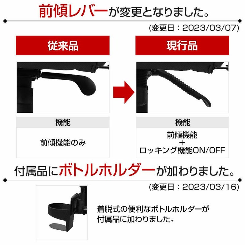 | 変更点 | ・座面高さ:410~490mmから415~495mmに変更 ・前傾レバー機能:前傾機能のみから前傾機能とロッキング機能ON/OFFに変更 (変更日:2023年3月7日) ・ボトルホルダー付属(着脱可能) (変更日:2023年3月16日) |