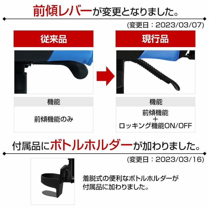 | 変更点 | ・座面高さ:410~490mmから415~495mmに変更 ・前傾レバー機能:前傾機能のみから前傾機能とロッキング機能ON/OFFに変更 (変更日:2023年3月7日) ・ボトルホルダー付属(着脱可能) (変更日:2023年3月16日) |
