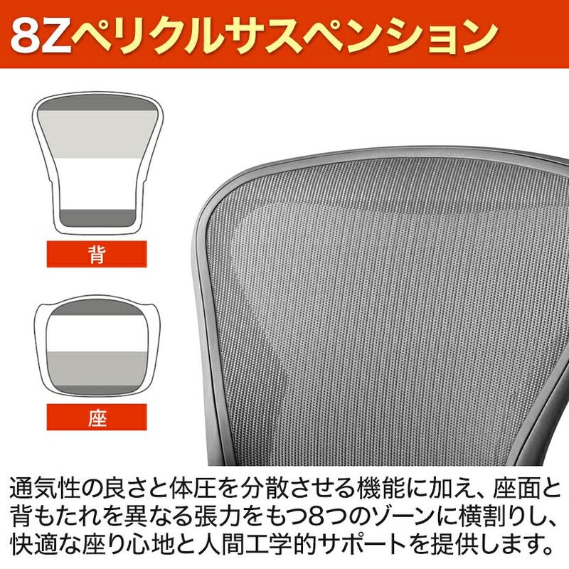通気性の良さと体圧を分散させる革新的な機能に加え、座面と背もたれを異なる張力をもつ8つのゾーンに横割りし、さらに快適な座り心地と人間工学的サポートを提供します。