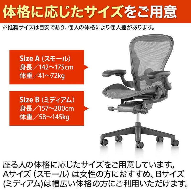 座る人の体格に応じたサイズをご用意しています。Aサイズ(スモール)は女性の方におすすめ、Bサイズ(ミディアム)は幅広い体格の方にご利用いただけます。(サイズの詳細は商品についてをご確認ください)