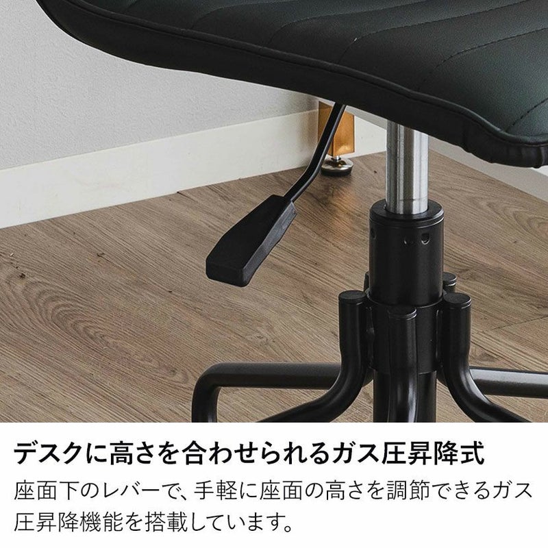 座面下のレバーで、手軽に座面の高さを調節できるガス圧昇降機能を搭載しています。