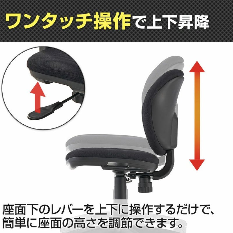 座面下のレバーを上下に操作するだけで、簡単に座面の高さを調節できます。デスクや体格に合わせた高さに調節することで、目の疲れ・肩こり・腰痛を軽減します。