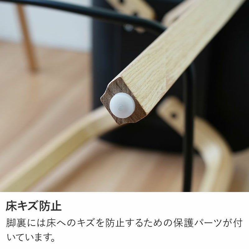 ナチュラルな木脚に映えるブラックの足置きが付いています。足の負担を軽減し、デザインのアクセントにも。