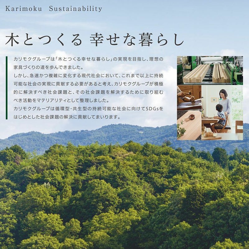 雄大な自然の中で育まれた天然木を活かし、最新の技術を取り入れ、「人と家具」という目線から人間工学を追求し、暮らしにマッチしたインテリア空間を造形していく, カリモクの家具は、グループ各社が培った技術・情報等を結集し品質・お客様満足の向上を図っています。 独自の情報網による調査や市場動向に基づいた商品開発力をはじめ、卓越した生産技術力や品質管理体制、安定した資材提供、さらには緊密な連携力を発揮する販売・流通などが一体となり、木製家具国内生産トップという確固たる信頼性を構築しています。グループ一丸の総合力を駆使し、家具を通じて快適なインテリア空間のご提案を行っている国内トップメーカーです。