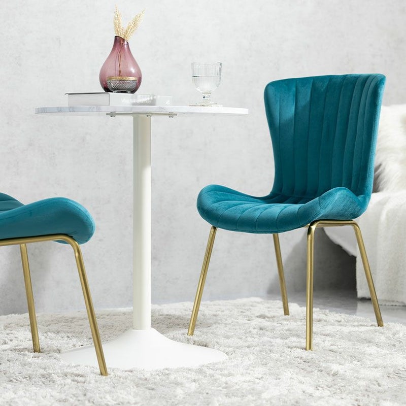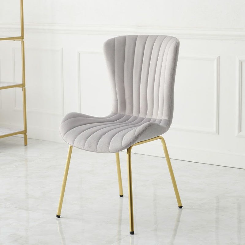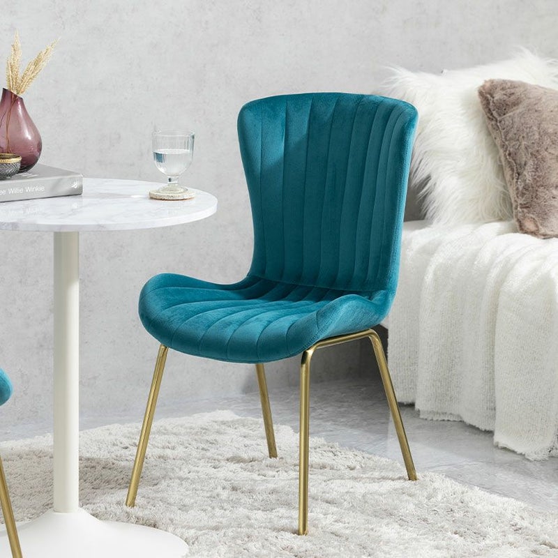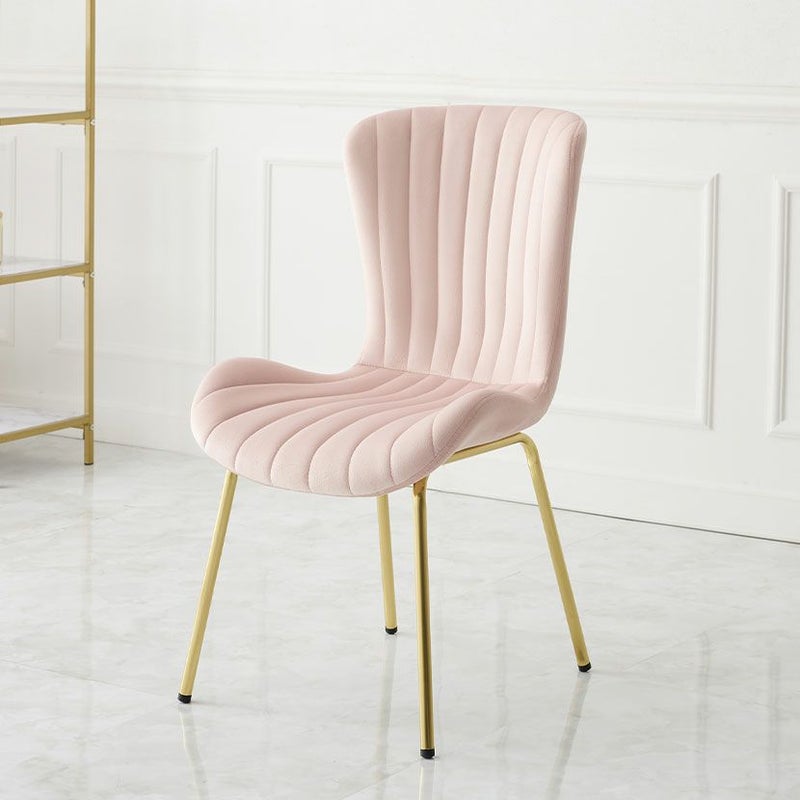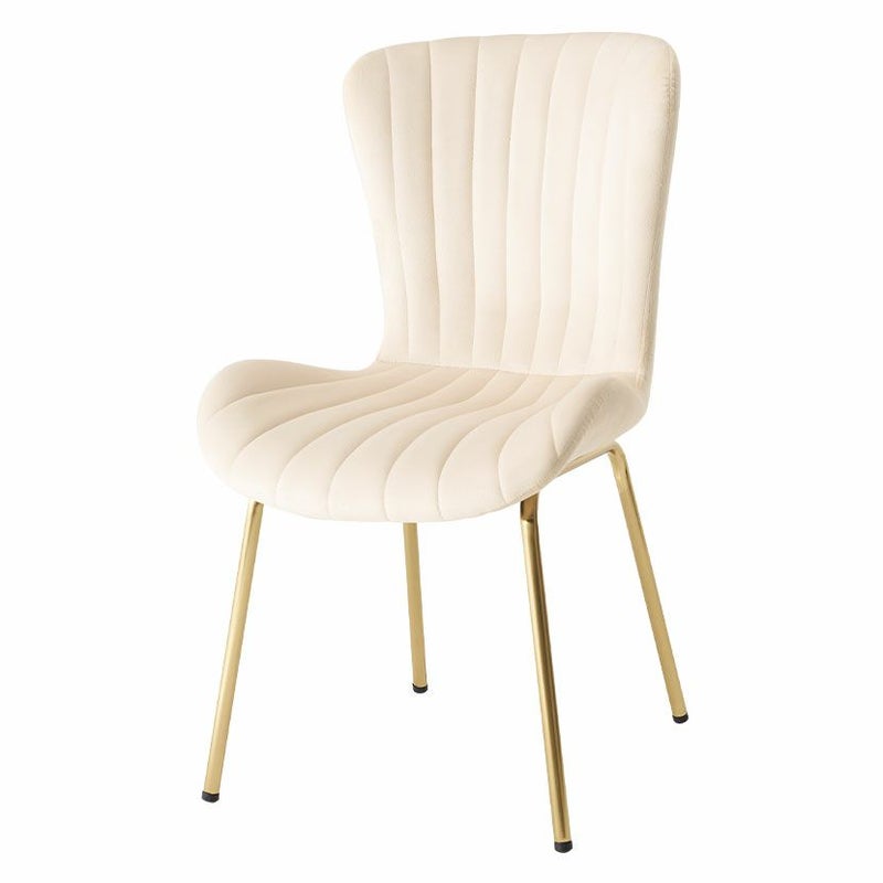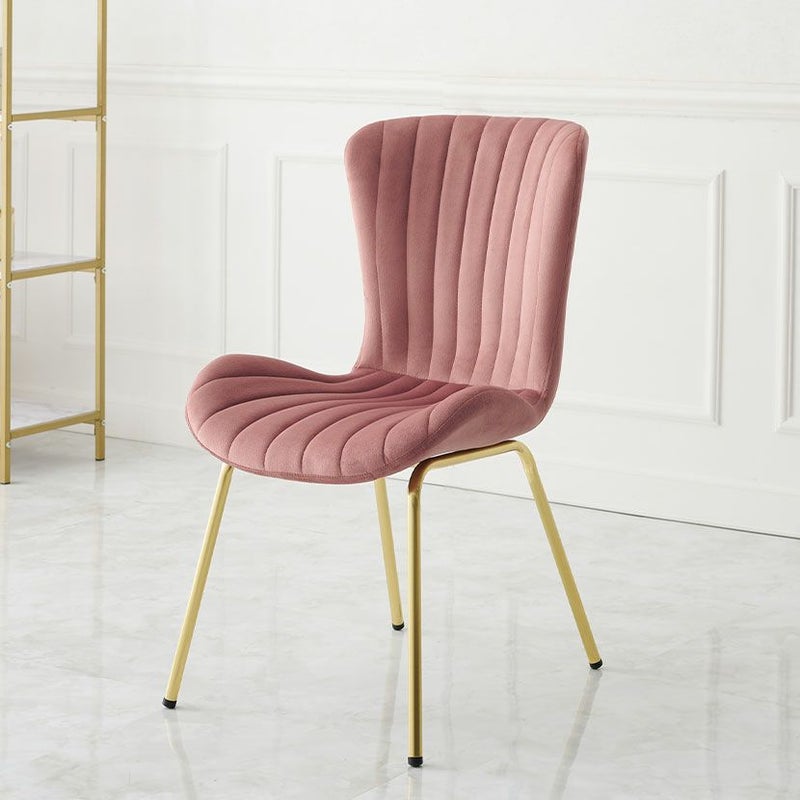 貝殻のようなシルエットにゴールドの脚がエレガントな、ベロア風生地のダイニングチェアです。