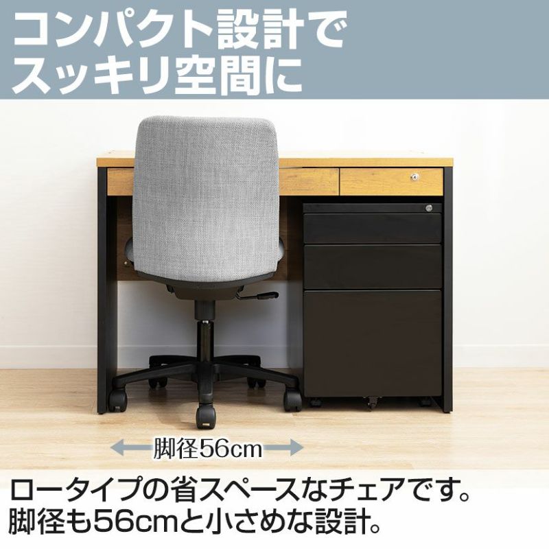 脚径はわずか560mmとコンパクト設計。脚幅が600mm以上の机ならすっぽり収めることができます。