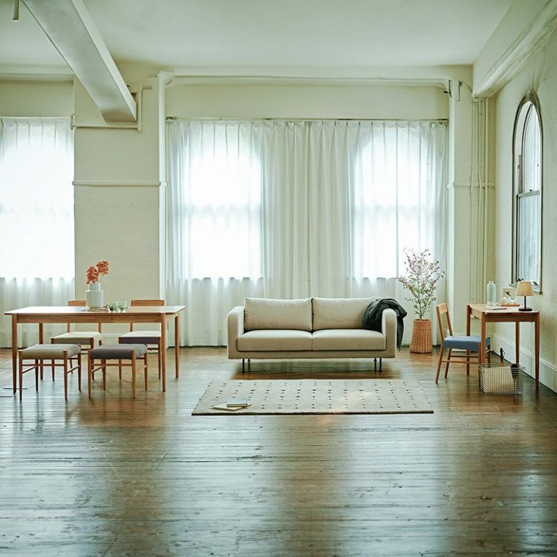 | 材質 | ファブリック / ポリエステル100% クッション材 / ウレタンフォーム、ウェービングテープ フレーム / オーク無垢材(ラッカー塗装) |