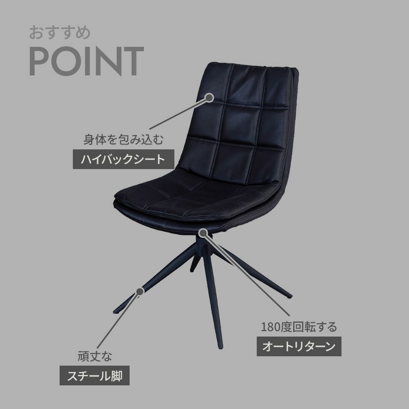 座面は180度回転し、自動で元の位置に戻るオートリターン機能付き。立ち回りの際に便利です。