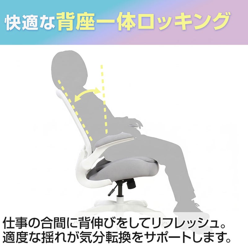 肘掛けを跳ね上げてデスク下に収納可能。限られたスペースを有効活用でき、お部屋の動線も邪魔しません。やわらかなソフトパッドが腕を優しく支えます。