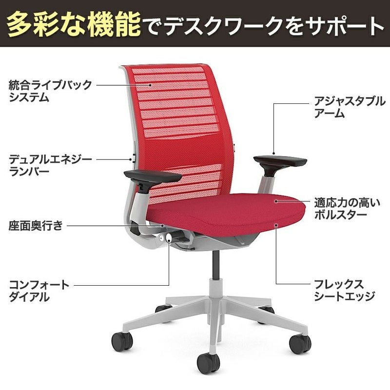 | 機能 | ・統合LIVEBACK(ライブバック)テクノロジー 背もたれにフレクサー(樹脂ワイヤー)機構内蔵。姿勢の変化に追従し腰椎周辺をサポート。 ・座面高さ調節 ・座面奥行き調節 ・アジャスタブルアーム 高さ、前後、左右、角度(首振り)の調節 ・コンフォートダイヤル アップライトバックロック ミッドストップリクライニング 体重感知機構付きリクライニング(20%増) 体重感知機構付きリクライニング |